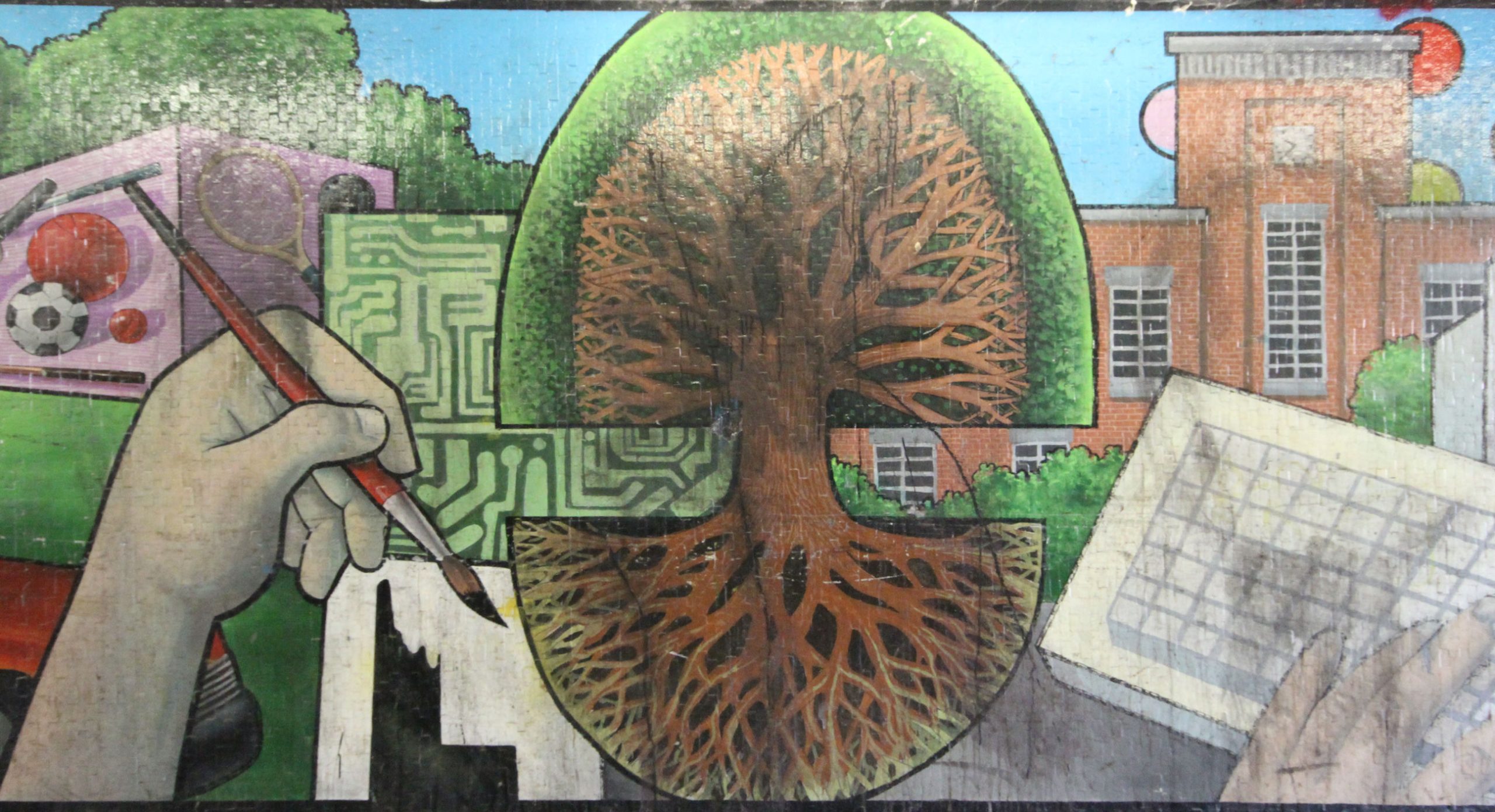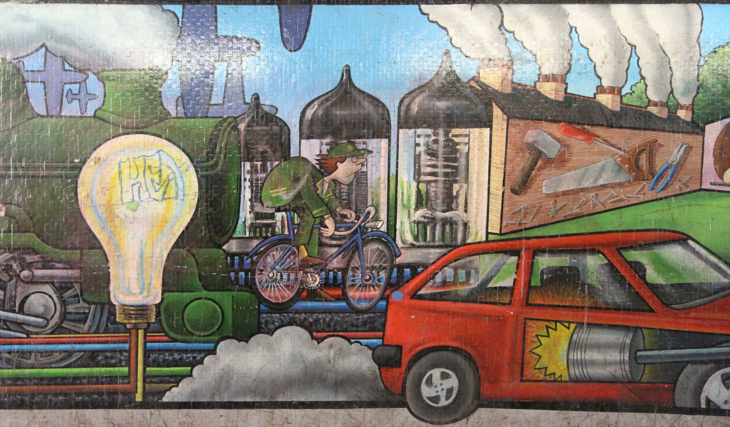 This covers more recent history than the one above, and illustrates science and technology from before the steam age to printed circuit boards and DNA. It features Coleridge Community College’s central tower. The car protrudes below the bottom border like the corn in the opposite one.