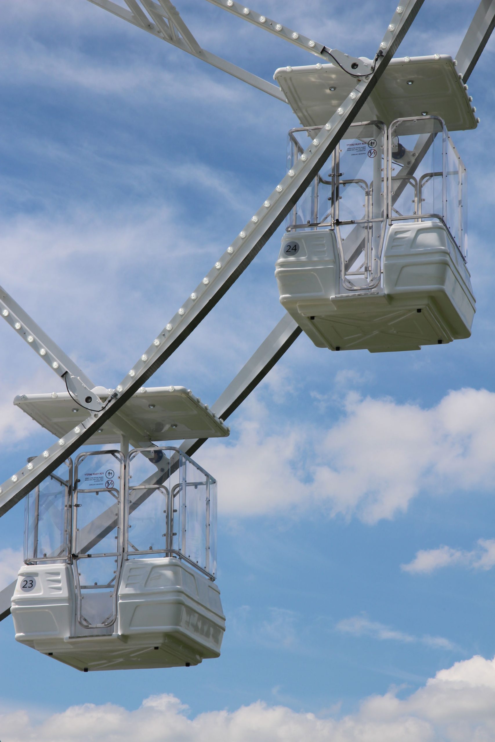 A close-up view of two of the wheel’s gondolas. Most are the same but there’s a single luxury VIP gondola with leather seats and champagne provided, which can be booked for special occasions.