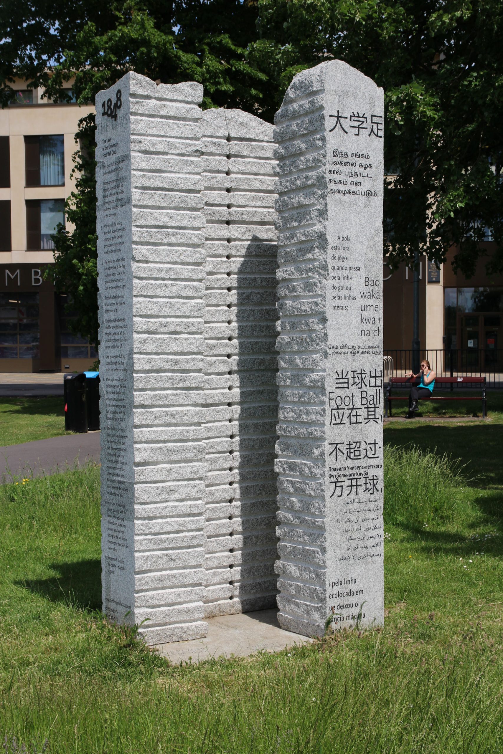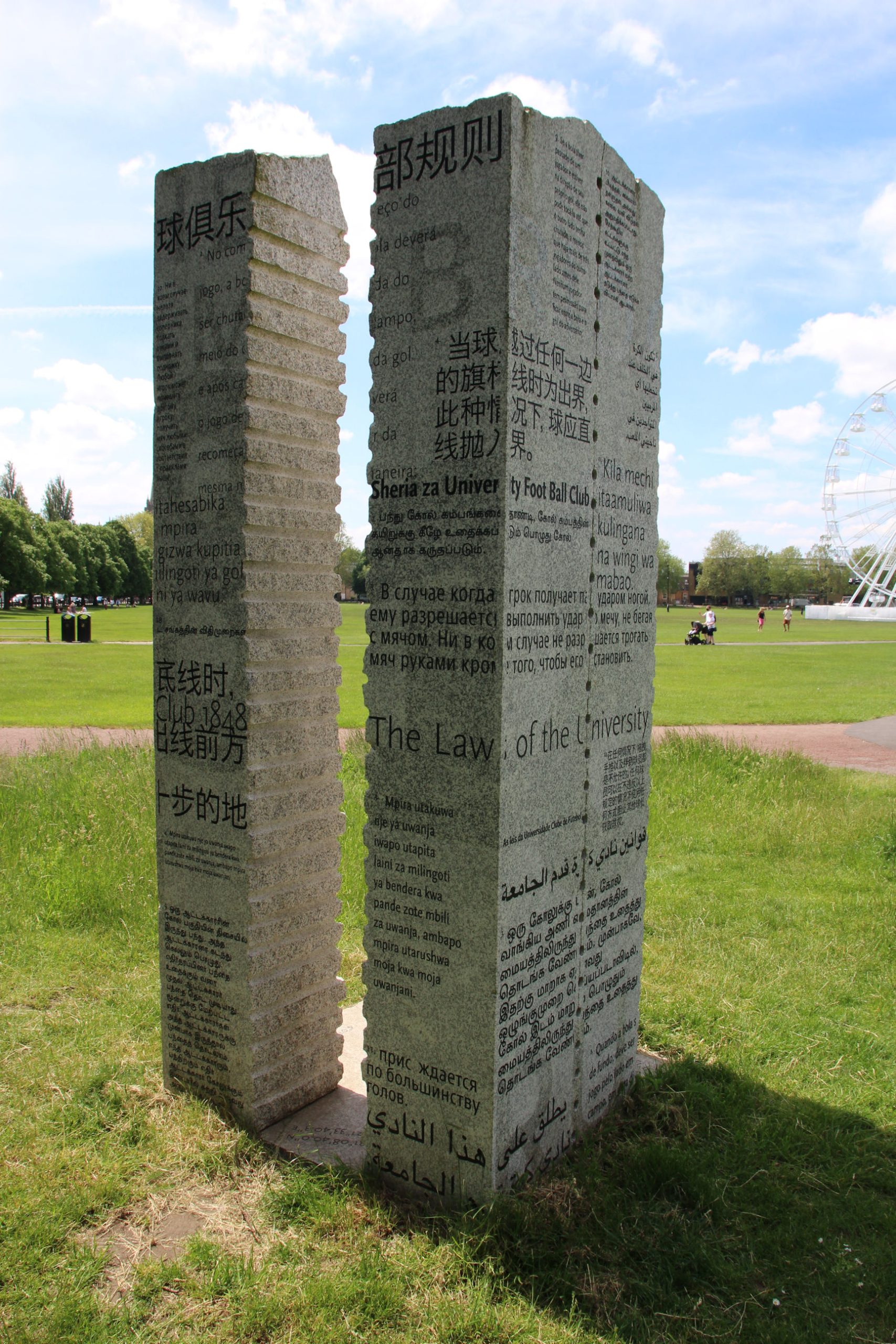 The Cambridge Rules Sculpture is engraved with the original 1848-era “Cambridge Rules” of modern-day football in a variety of languages. The rules were first written by students playing here. They were adopted largely unchanged by the Football Association in 1863.
