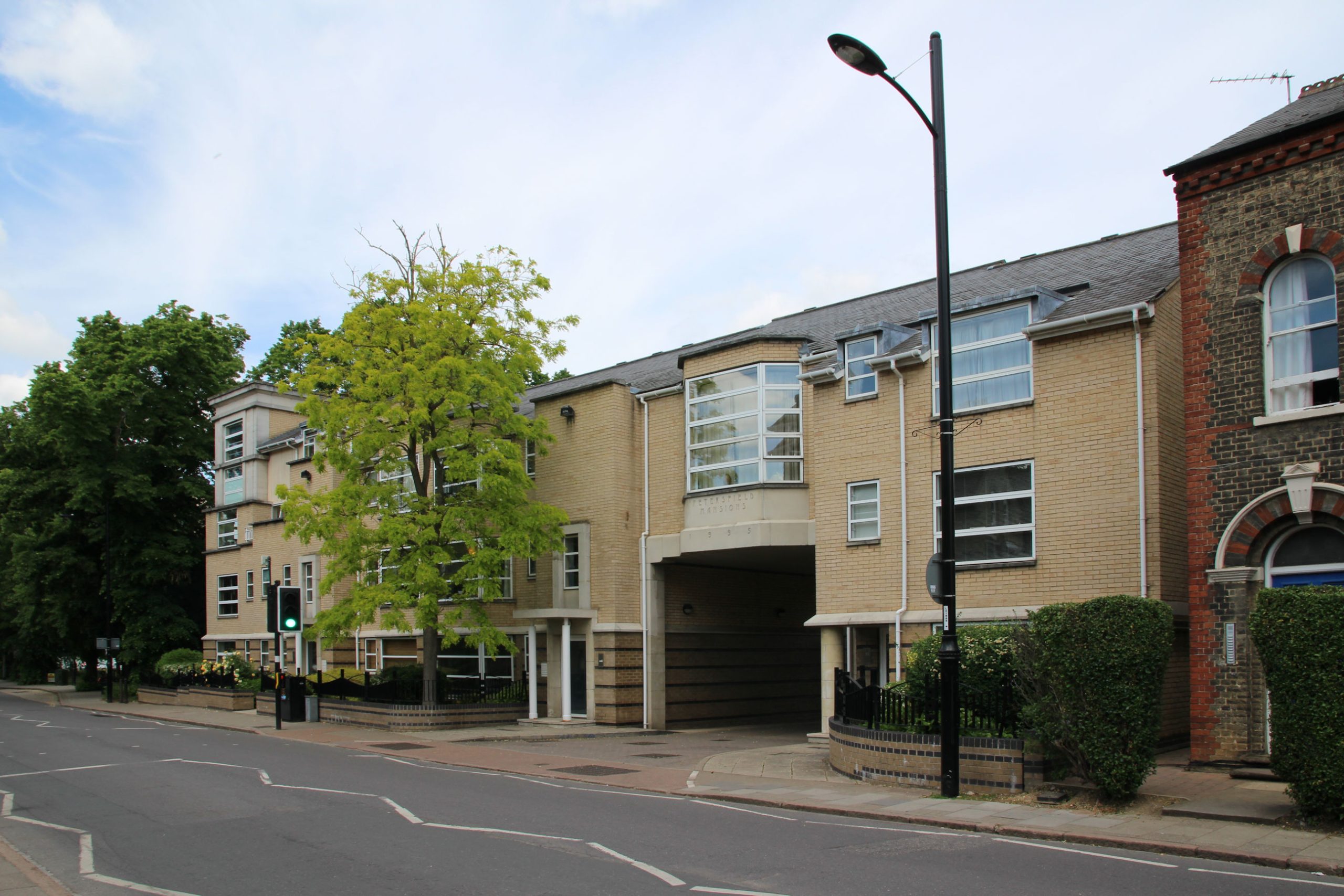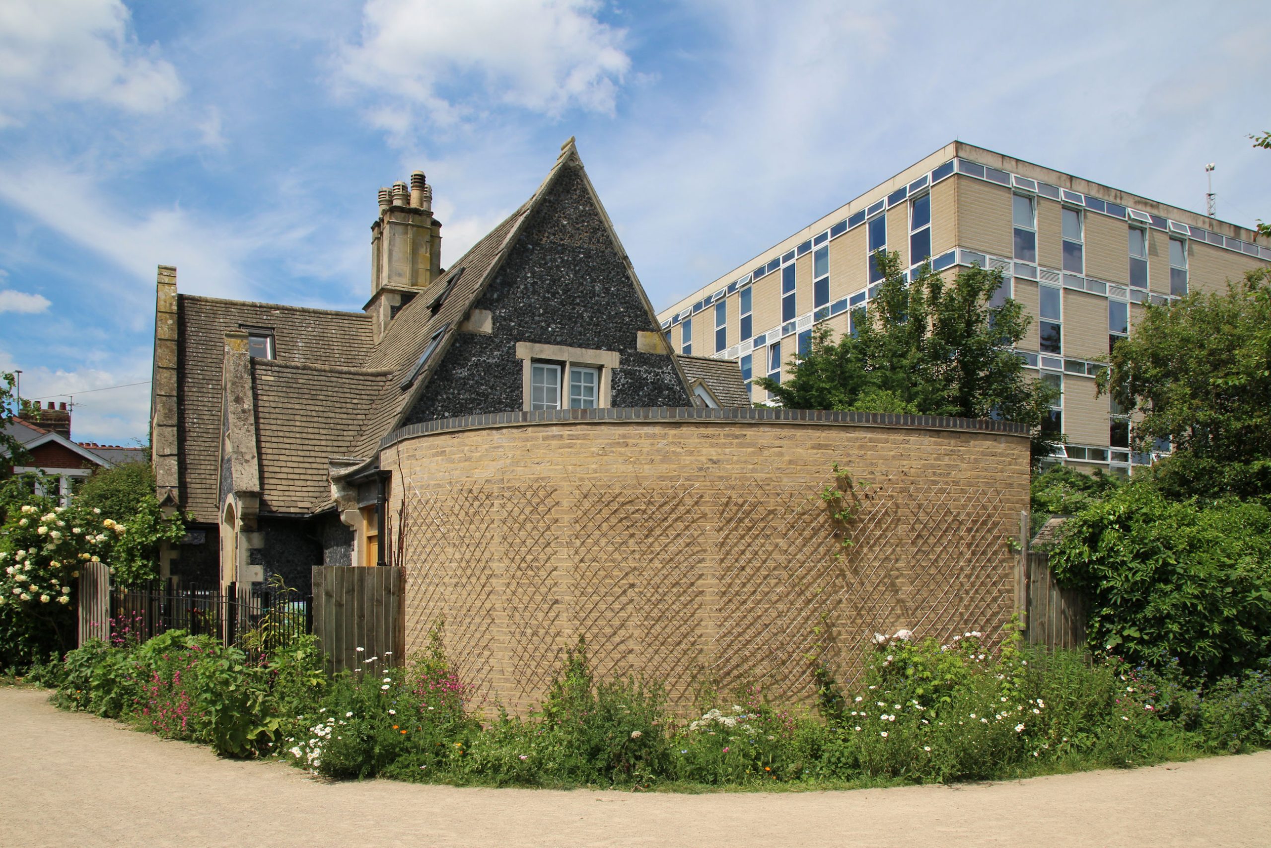 The lodge is pretty, but partially obscured by a wall and overshadowed by the Anglia Ruskin building behind it.