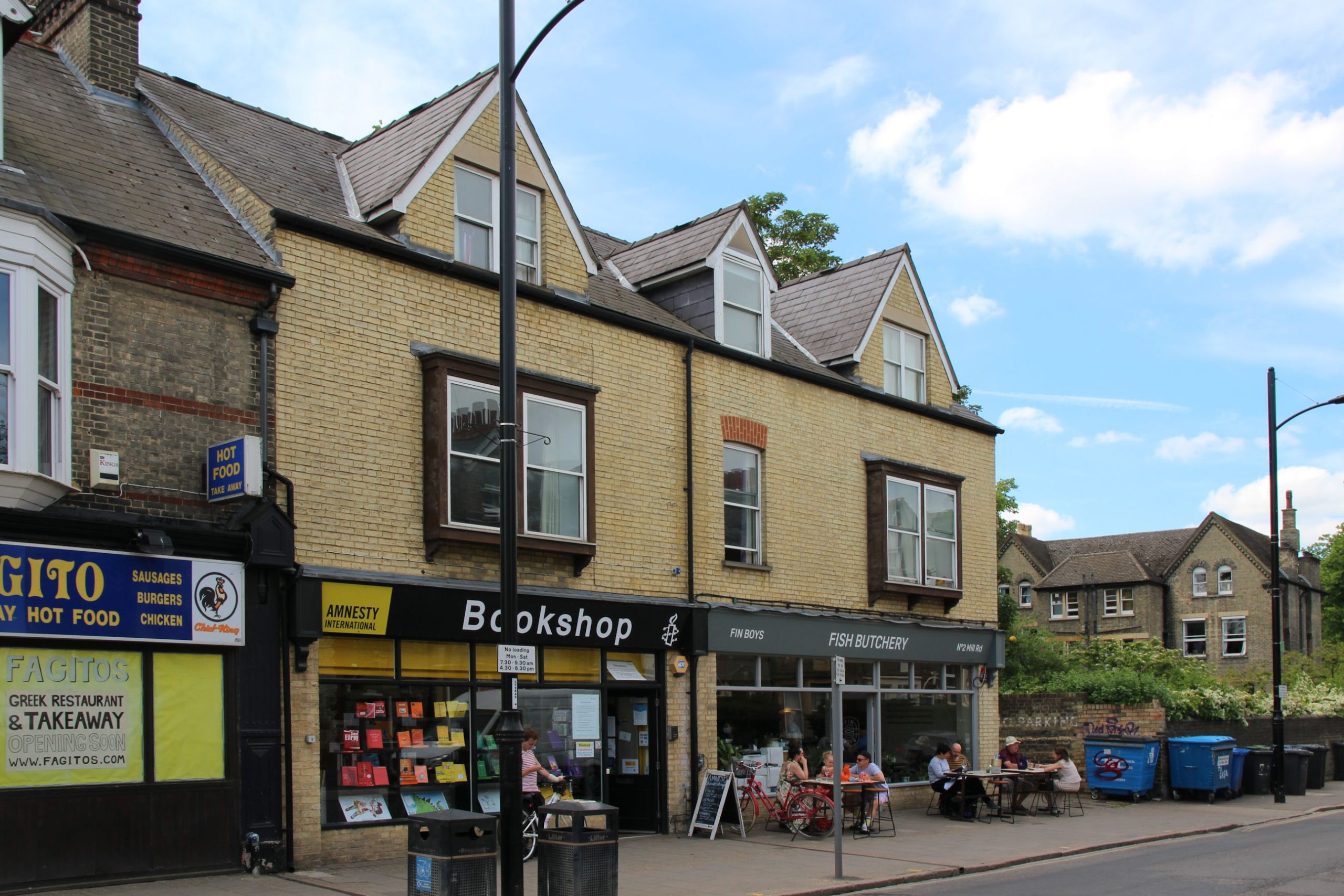 Along Mill Road from the pool, the former Oxfam shop has become a fish restaurant called Fish Butchery. The Amnesty Bookshop has arranged its window display in a rainbow, which catches attention in a way that a random display of books doesn’t.