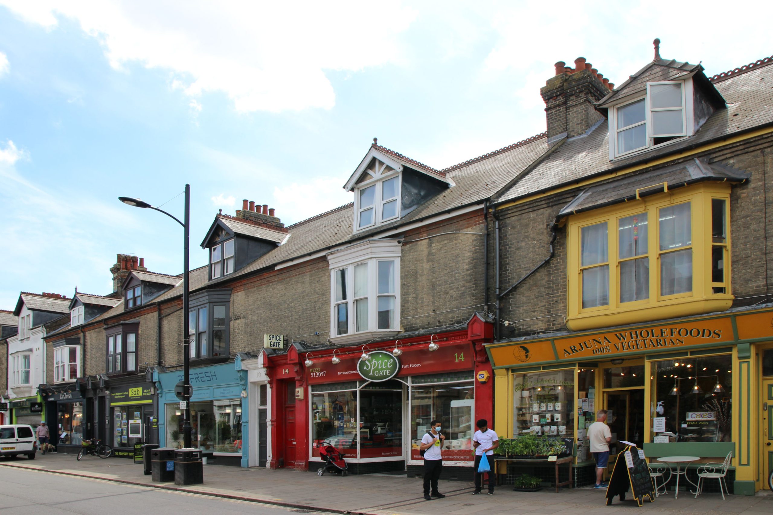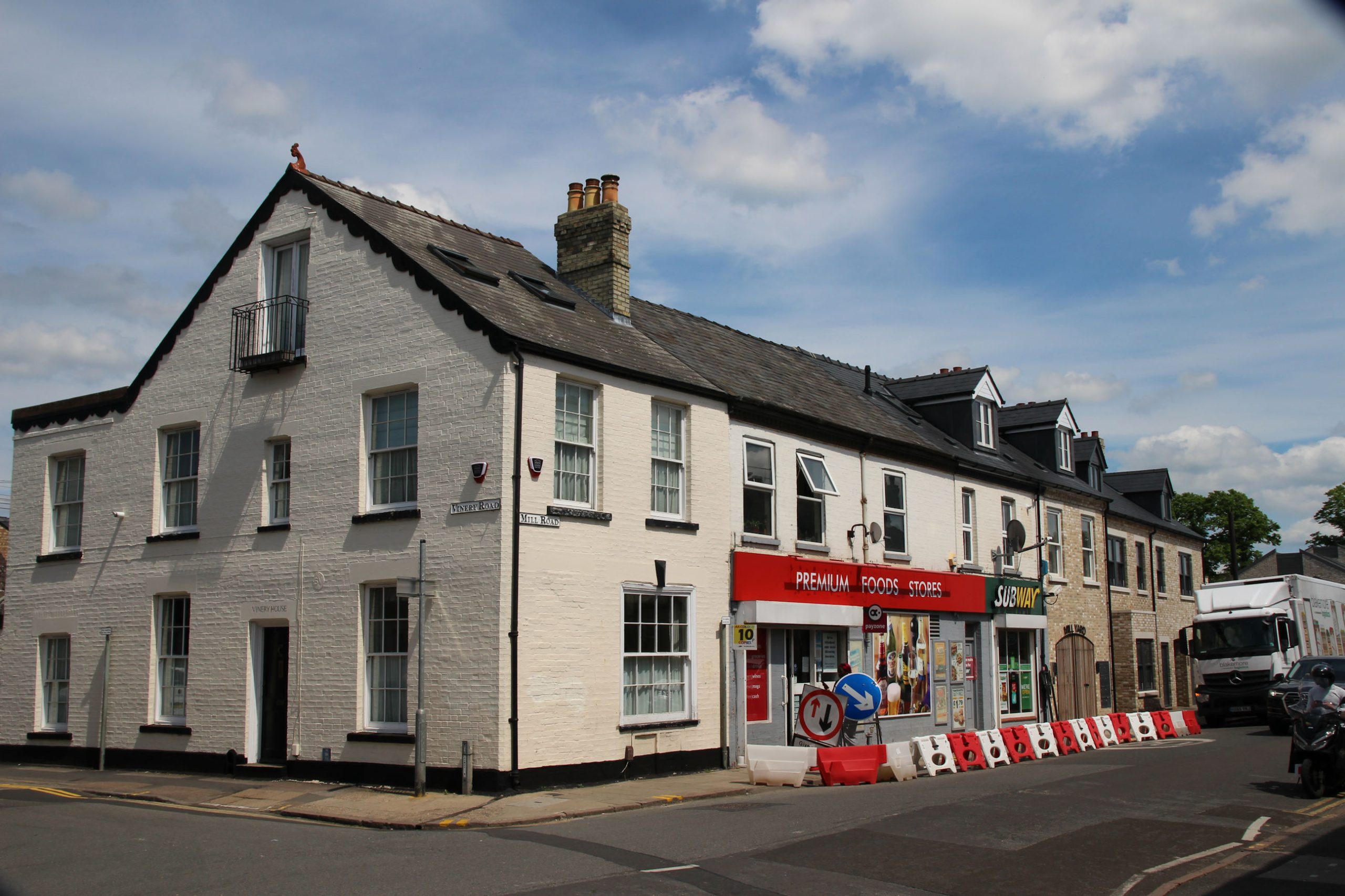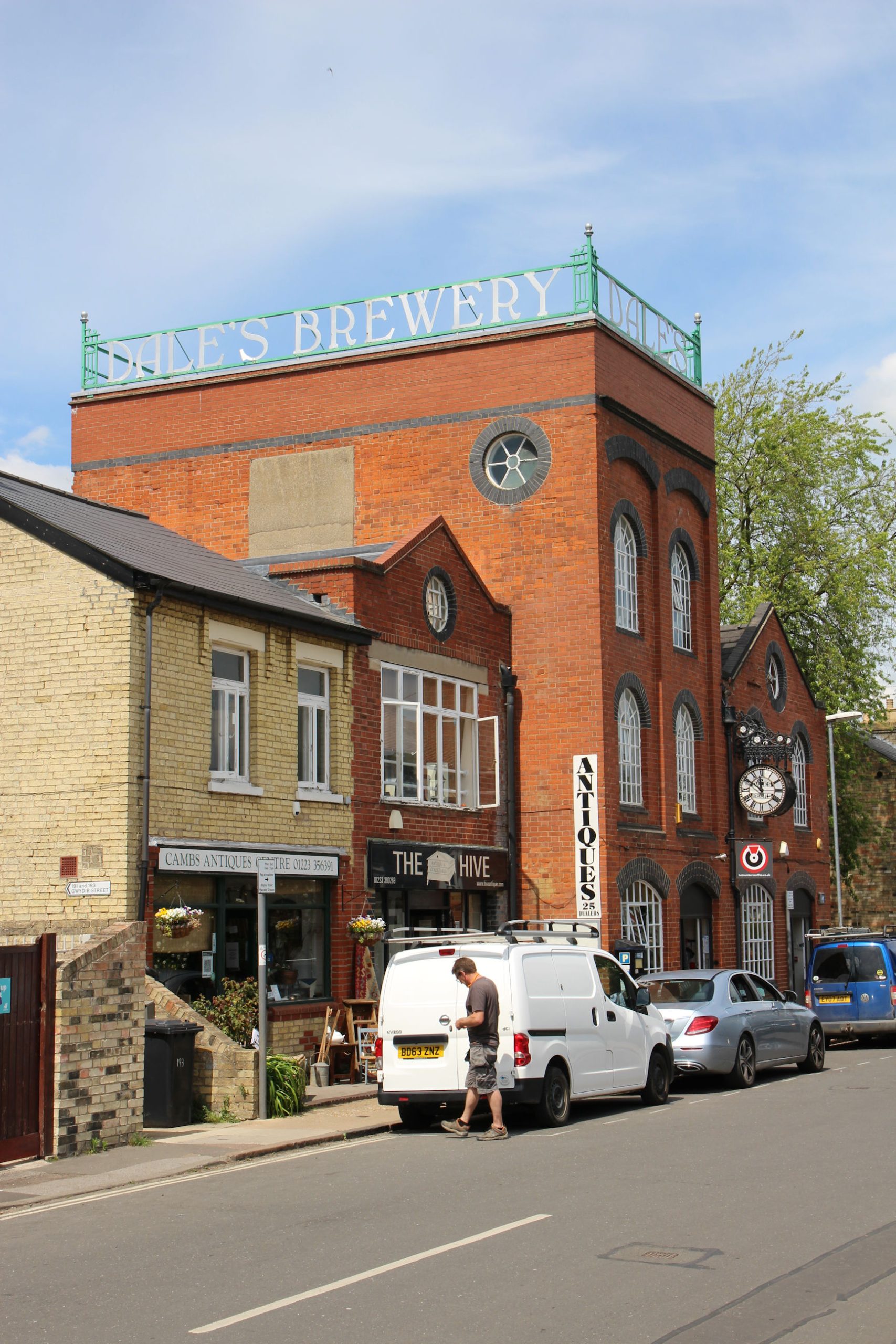 Looking north into Gwydir Street, the landmark Dale’s Brewery building now houses shops, workshops and offices.