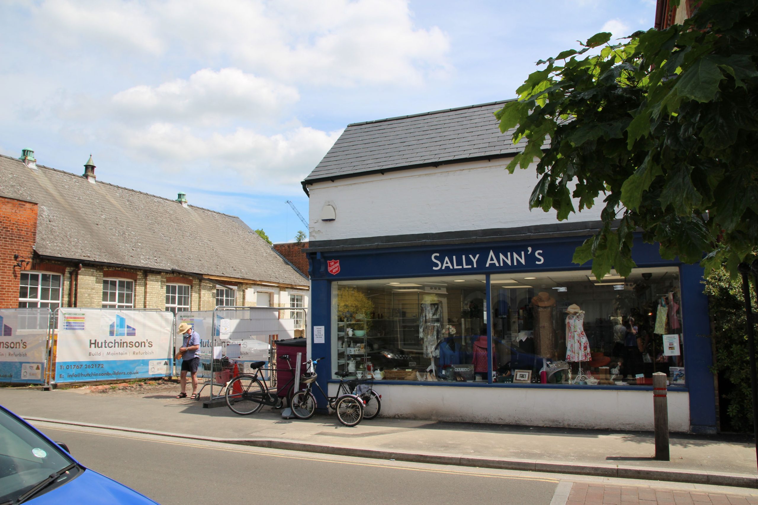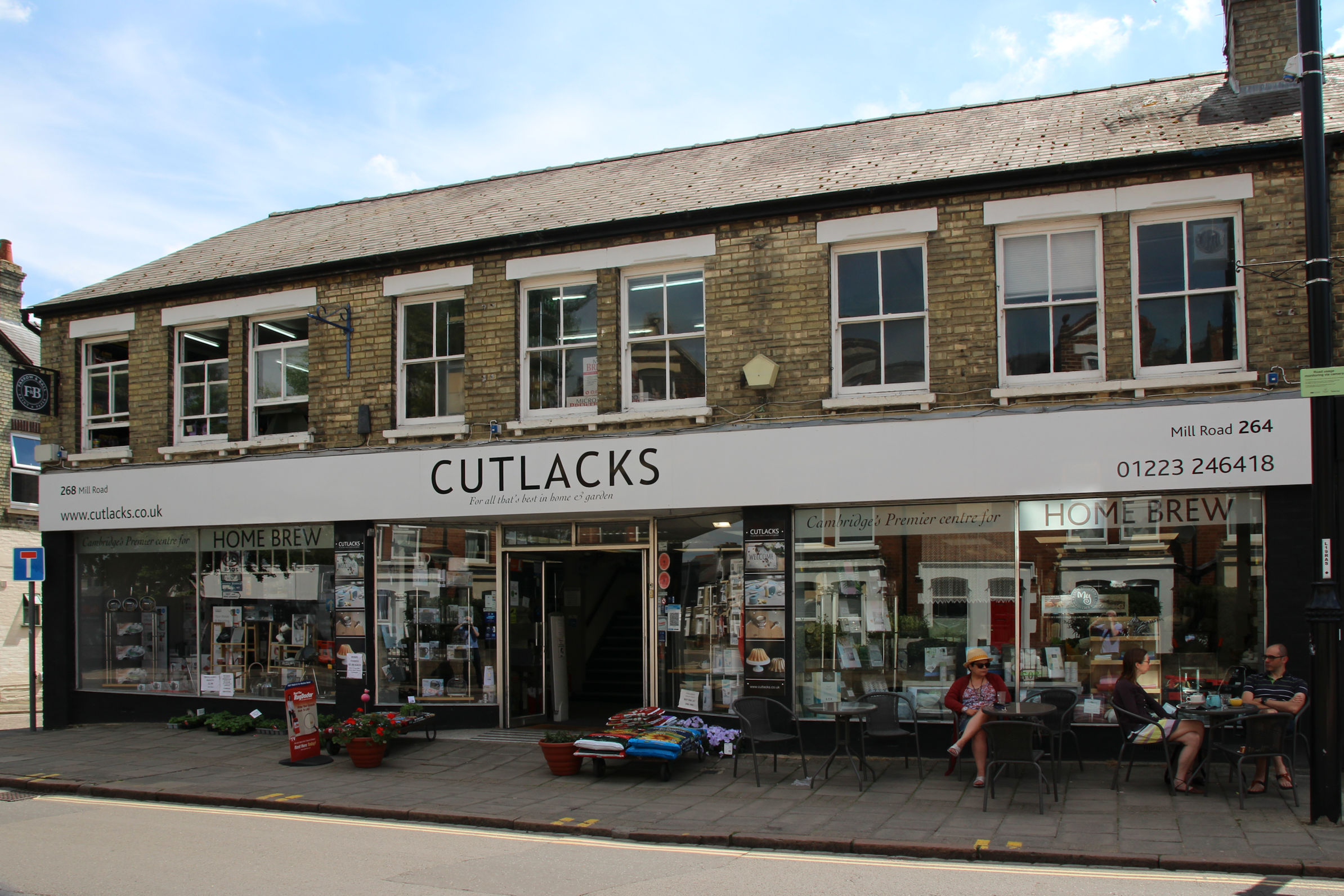 Cutlacks used to have several kitchen, garden and DIY stores in Cambridgeshire, but now only two remain: this one and one in Ely. To the right of it is the Relevant Record Cafe, a record store and cafe which presumably owns the pavement tables in this picture.