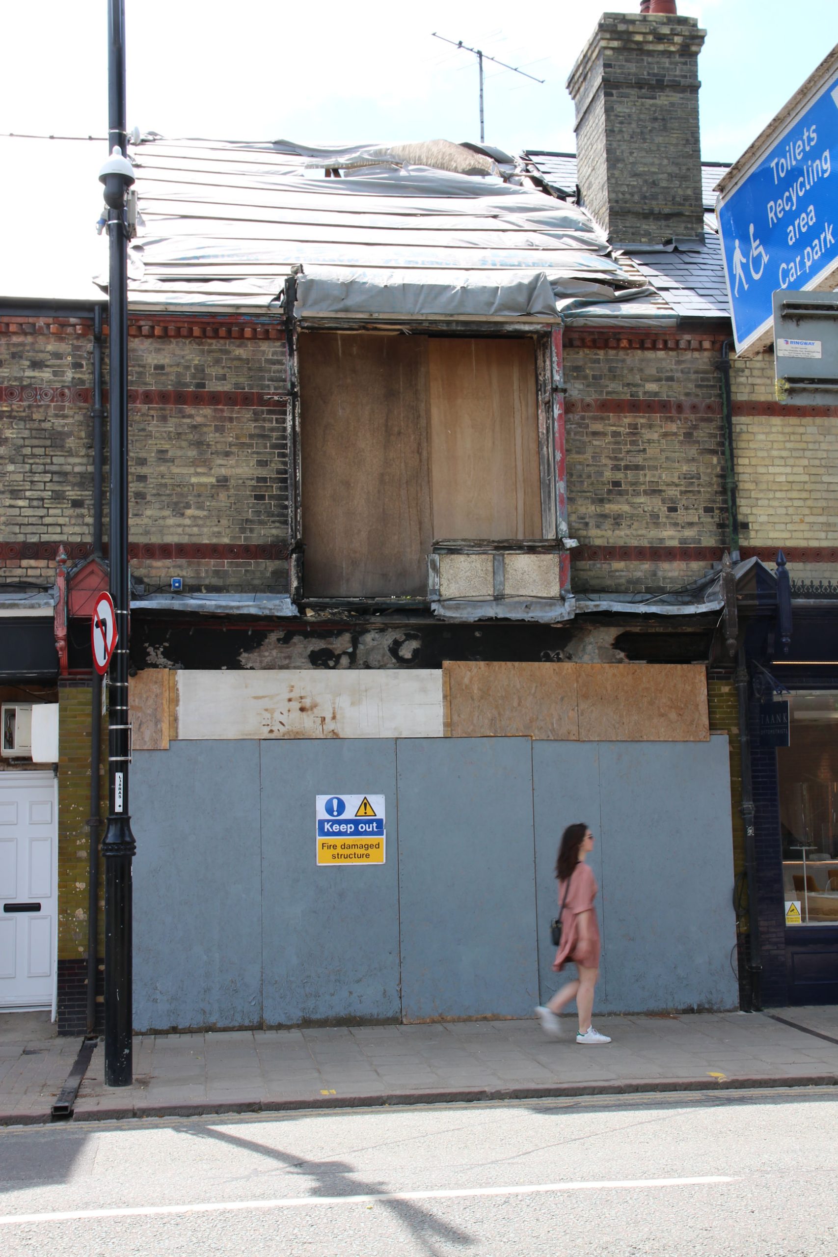 Two years ago a fire in the H. Gee electrical shop caused extensive damage. The next-door optometrist’s has reopened and the former tattoo parlour to the left is being refurbished, but there is no sign of work to repair the Gee shop itself.