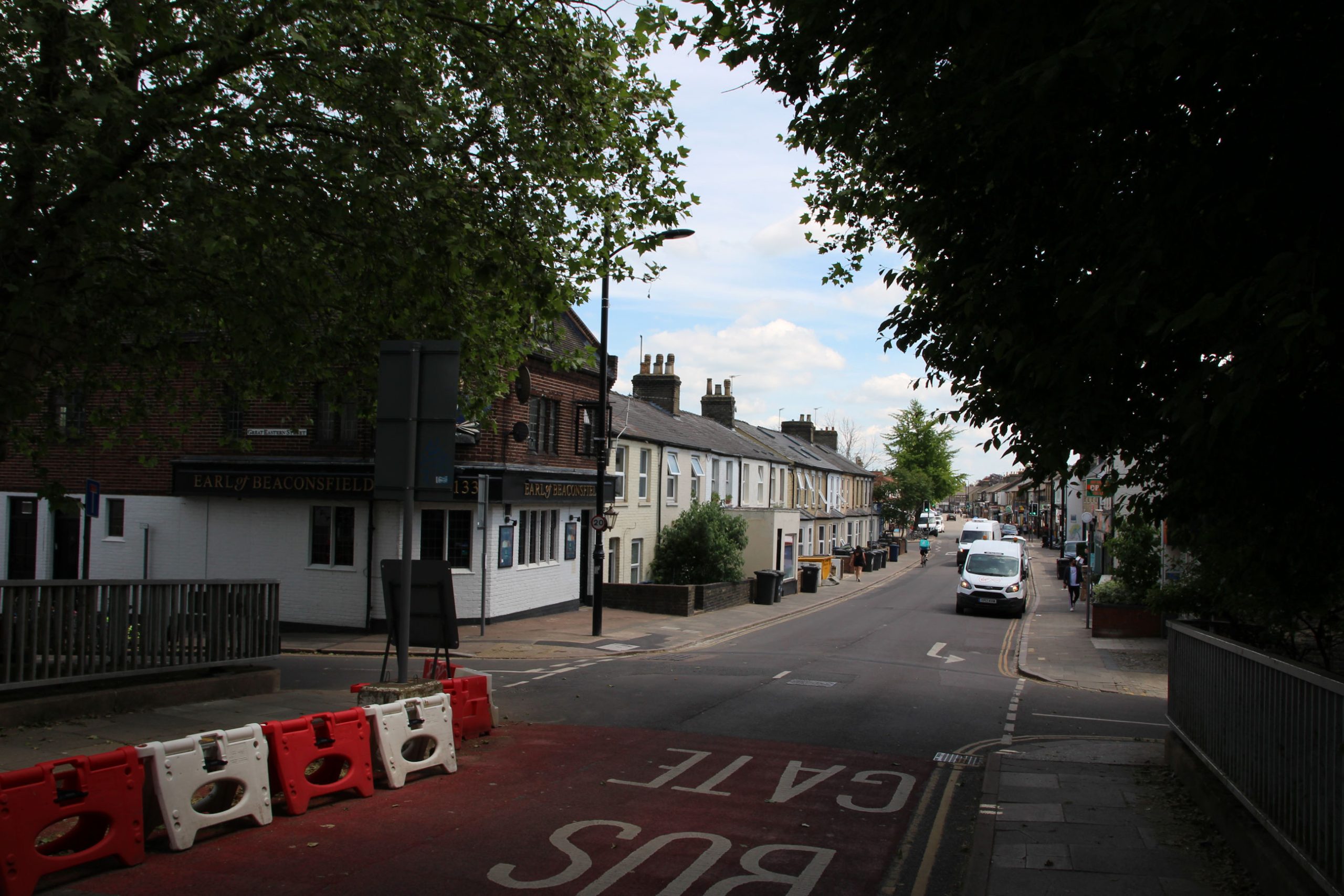 Looking back along Mill Road Broadway towards the bridge. No idea why anyone needs to be in the tanning salon today – it’s been hot and sunny all week.