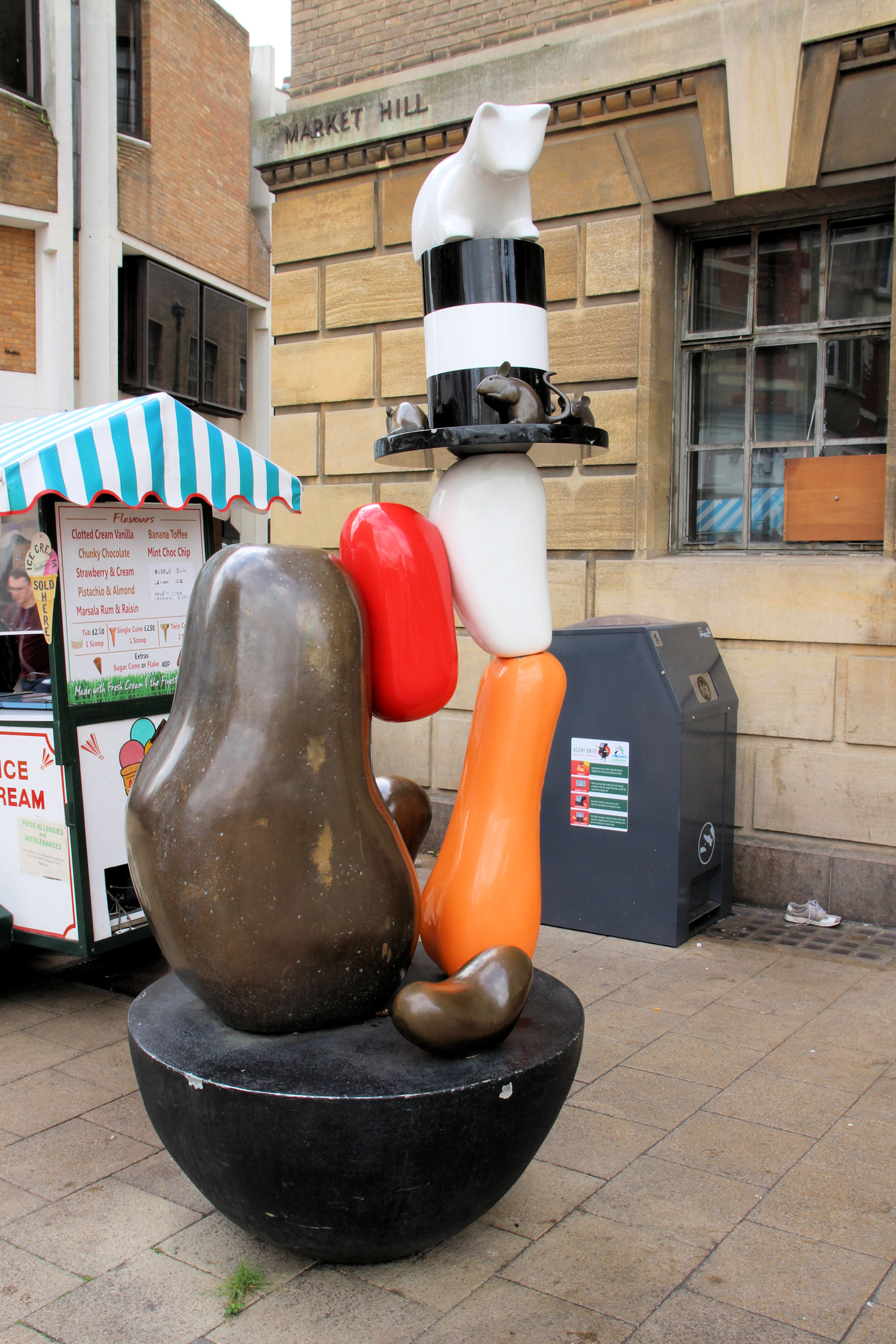 Memorial to Walter ‘Snowy’ Farr, a charity collector who fundraised in the Market Square, often with live animals. Depicts a cat and mice.
