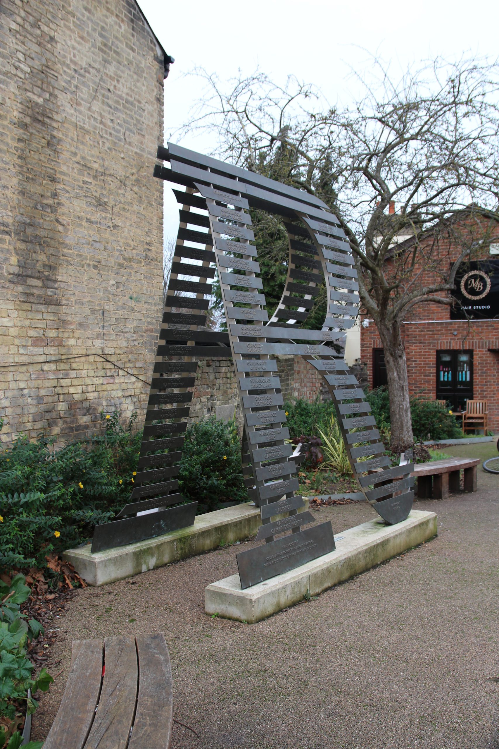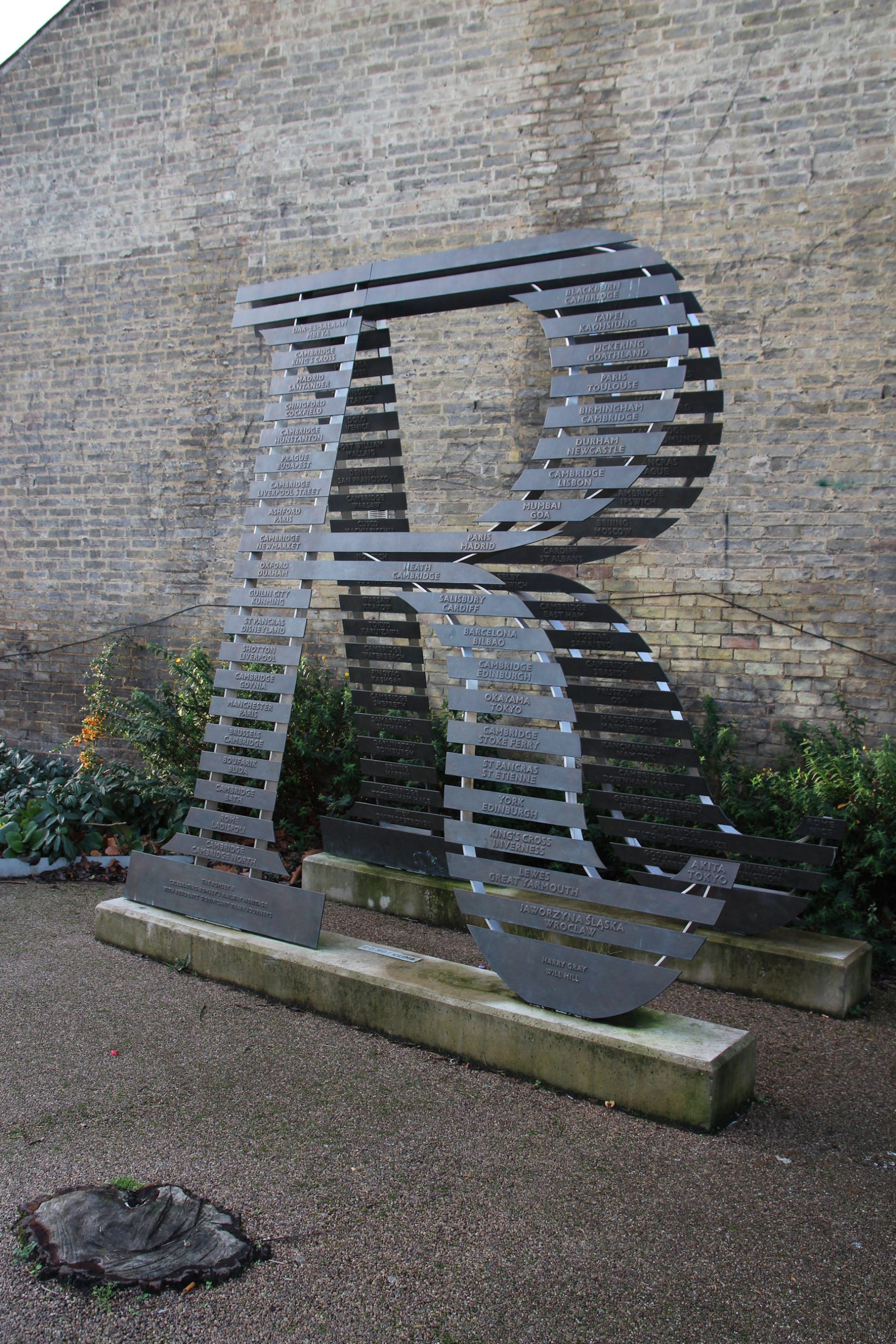 This commemorates the Romsey district’s railway heritage. It takes the form of a double letter ‘R’ in the style of railway tracks. The front ‘sleepers’ are bronze plaques engraved with station and destination names significant to local people.