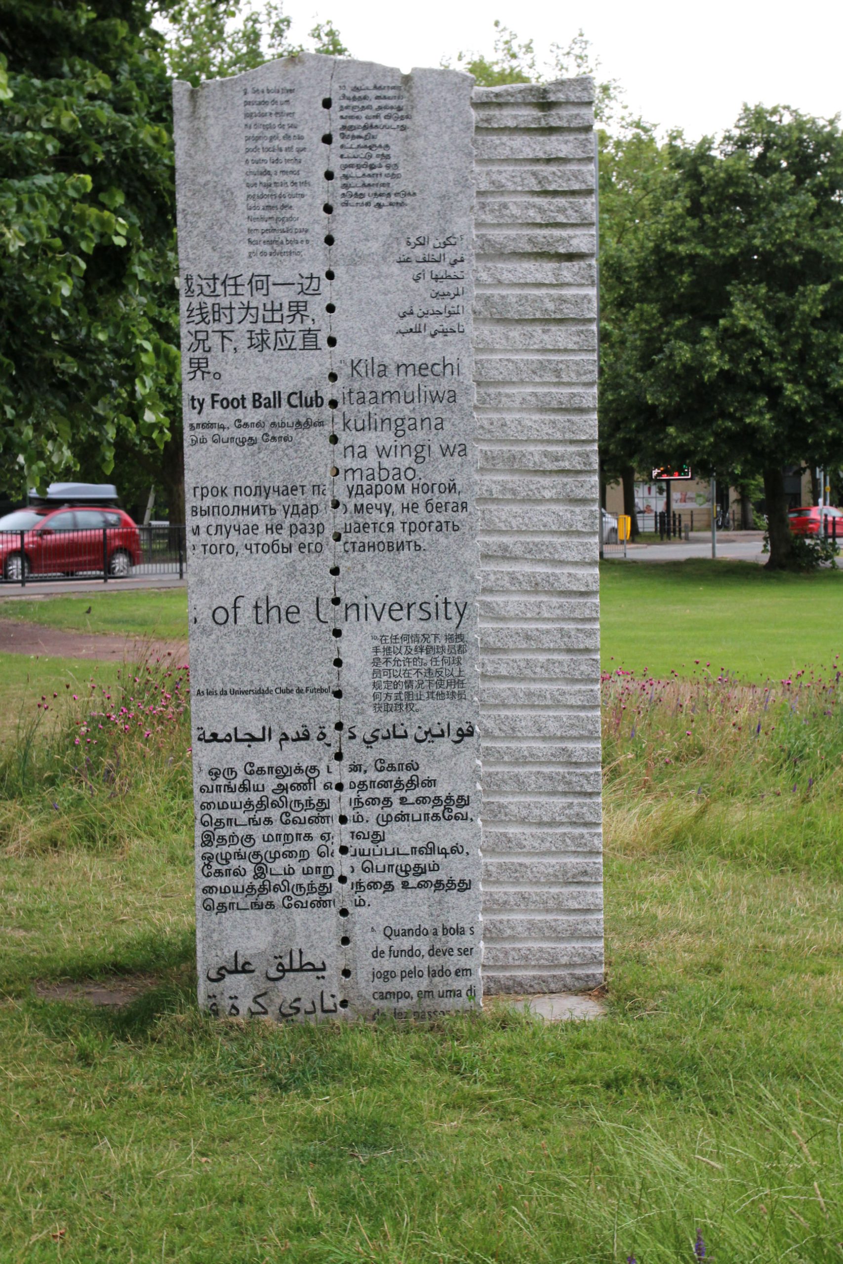 Four stones engraved with the original 1848 rules of football, much as adopted by the Football Association in 1863, in multiple languages. There are five more stones that have been sent to football-loving countries around the world.