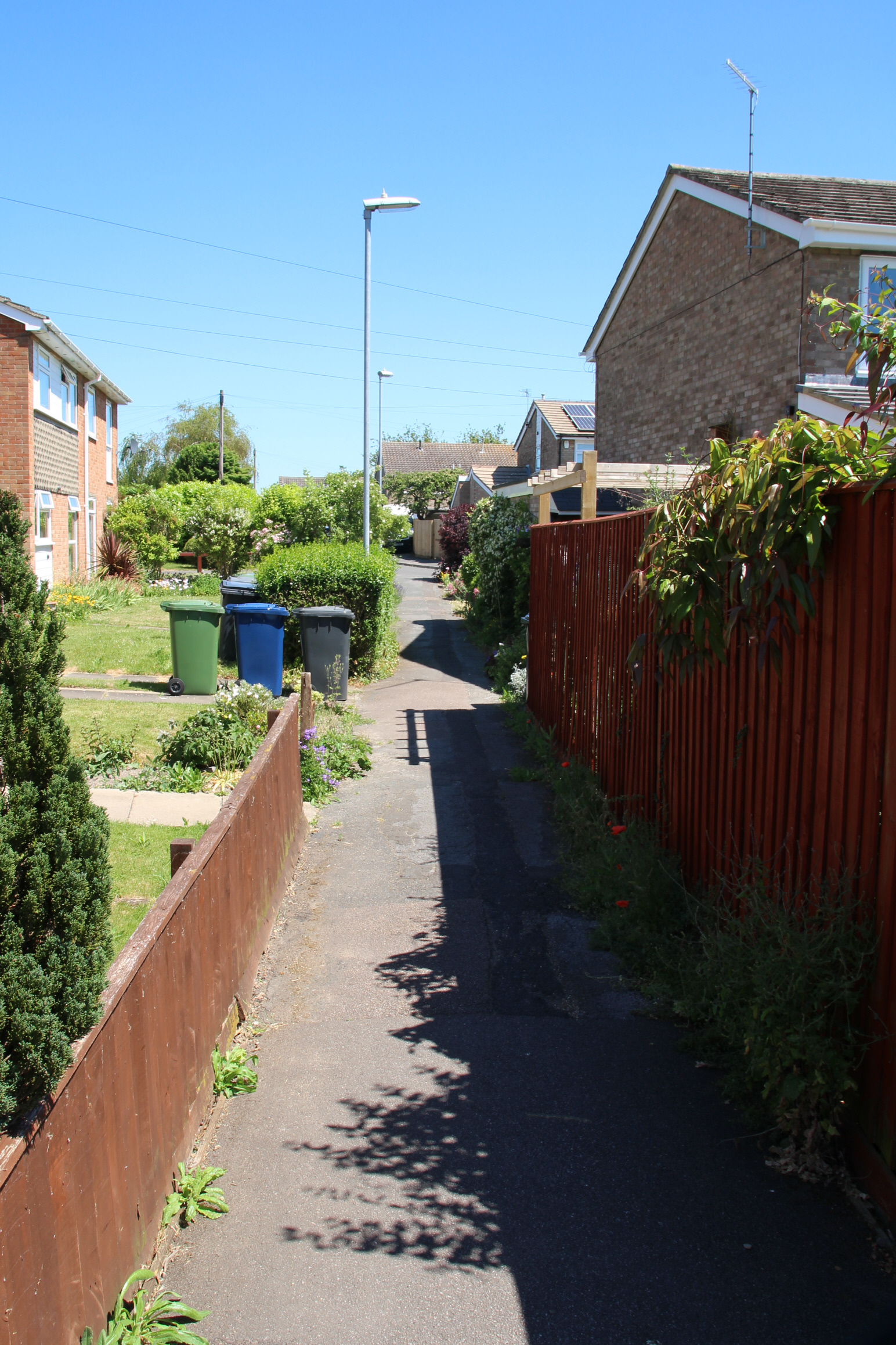 From the Cherry Hinton footpath I’ll head up this footpath through to Wolsey Way.