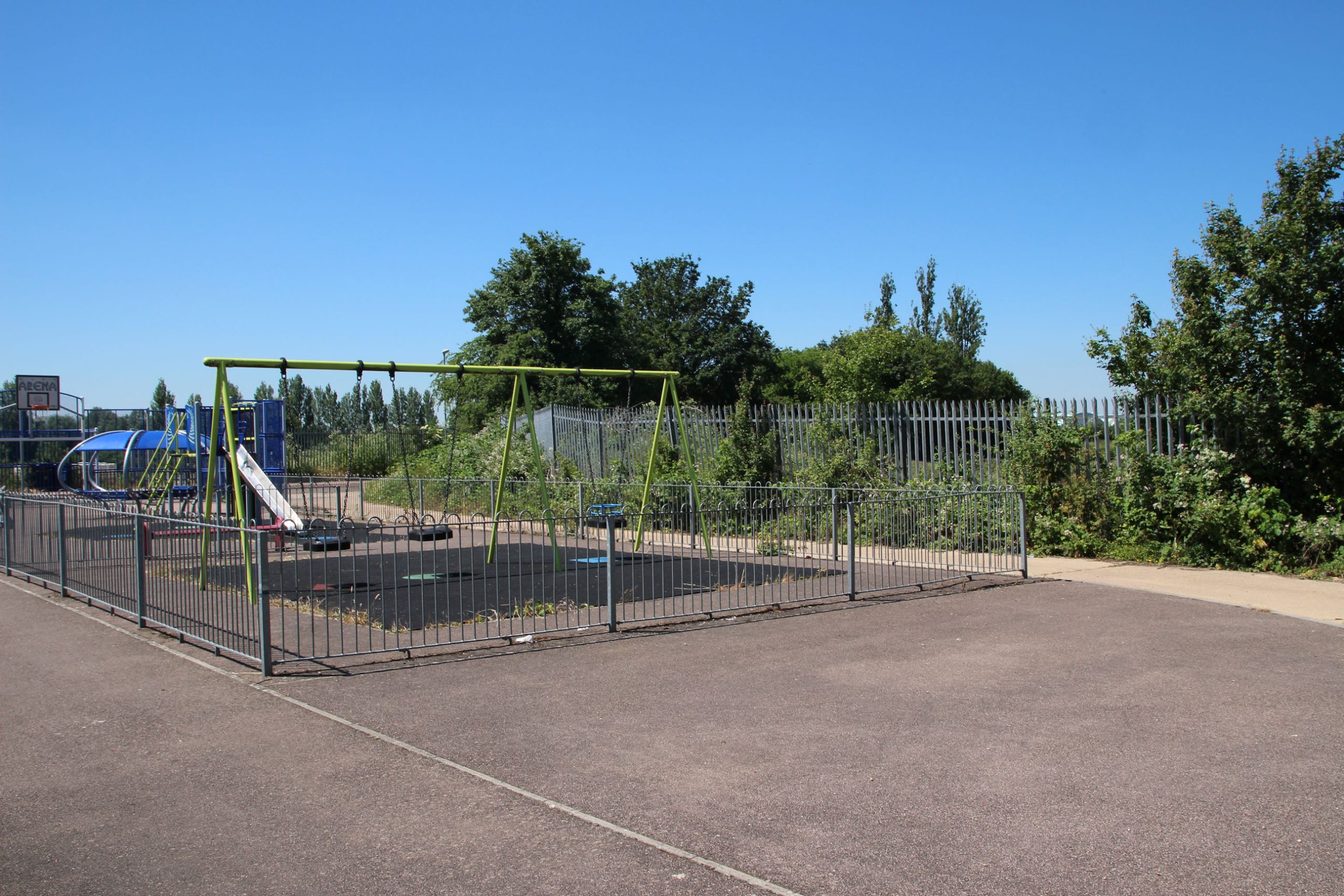 Behind the playground, Parcel A North and the driveway alongside it can be seen.
