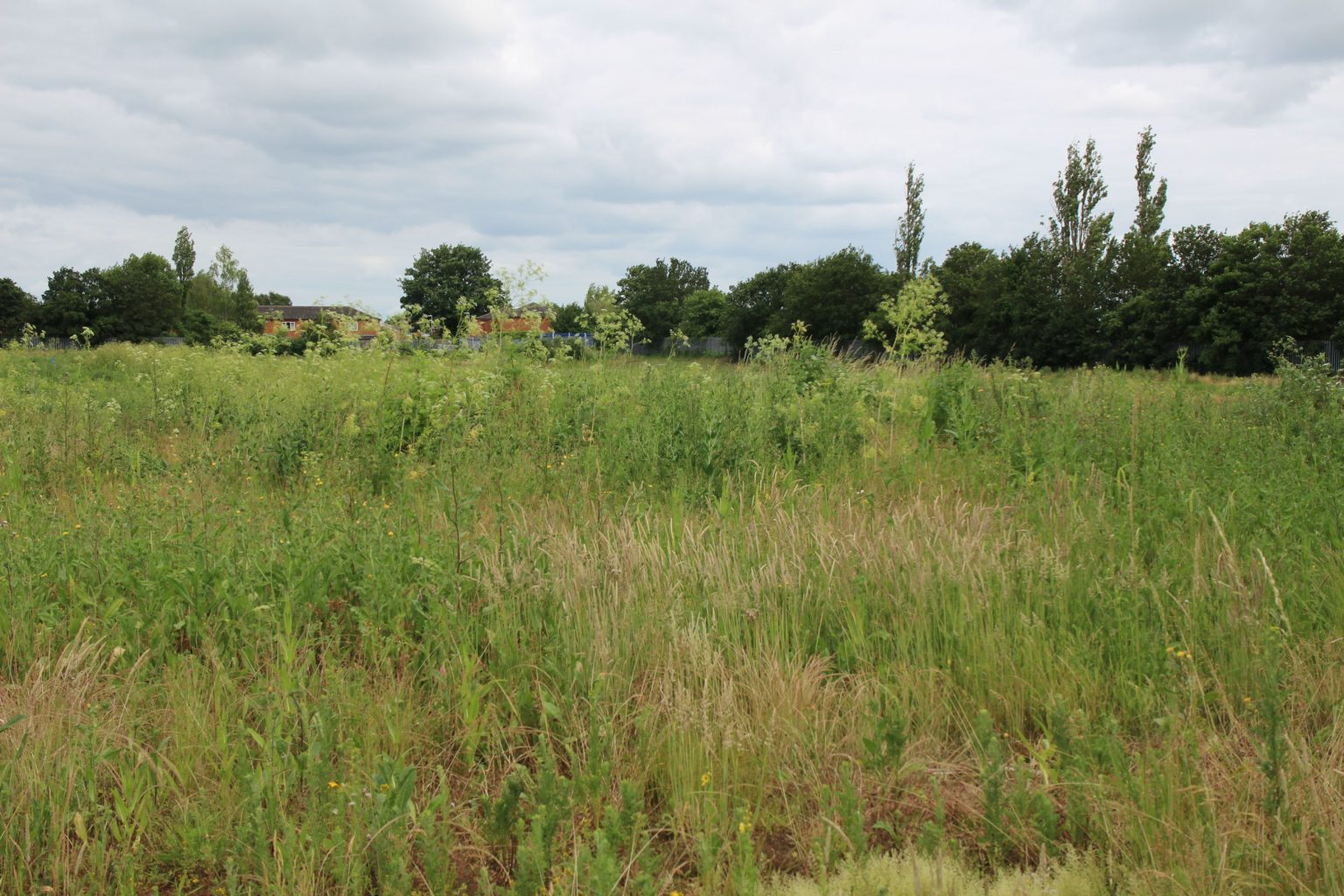This is the view across Parcel A North towards Coldham’s Lane. Compared with Parcel B, the vegetation is more scrubby with bare patches of rubble-like soil and blue tubes sticking out of the ground.